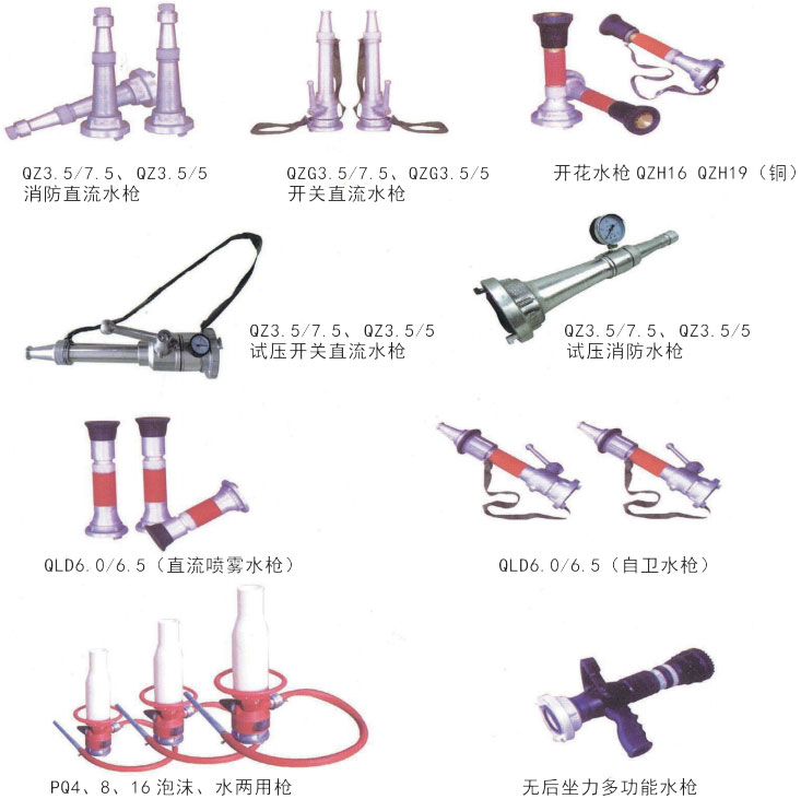 消防水枪是用来射水的灭火工具,用其与消防水带连接会喷射密集充实的水流。具有射程远、水流量大等优点。它由管牙接口、枪体和喷嘴等主要零部件组成。直流开关水枪,是直流水枪增加球阀开关等部件组成可以通过开关控制水流的水枪。多功能水枪是集直流、喷雾、启闭三种功能为一体水枪,能满足客户多种用途的需求。